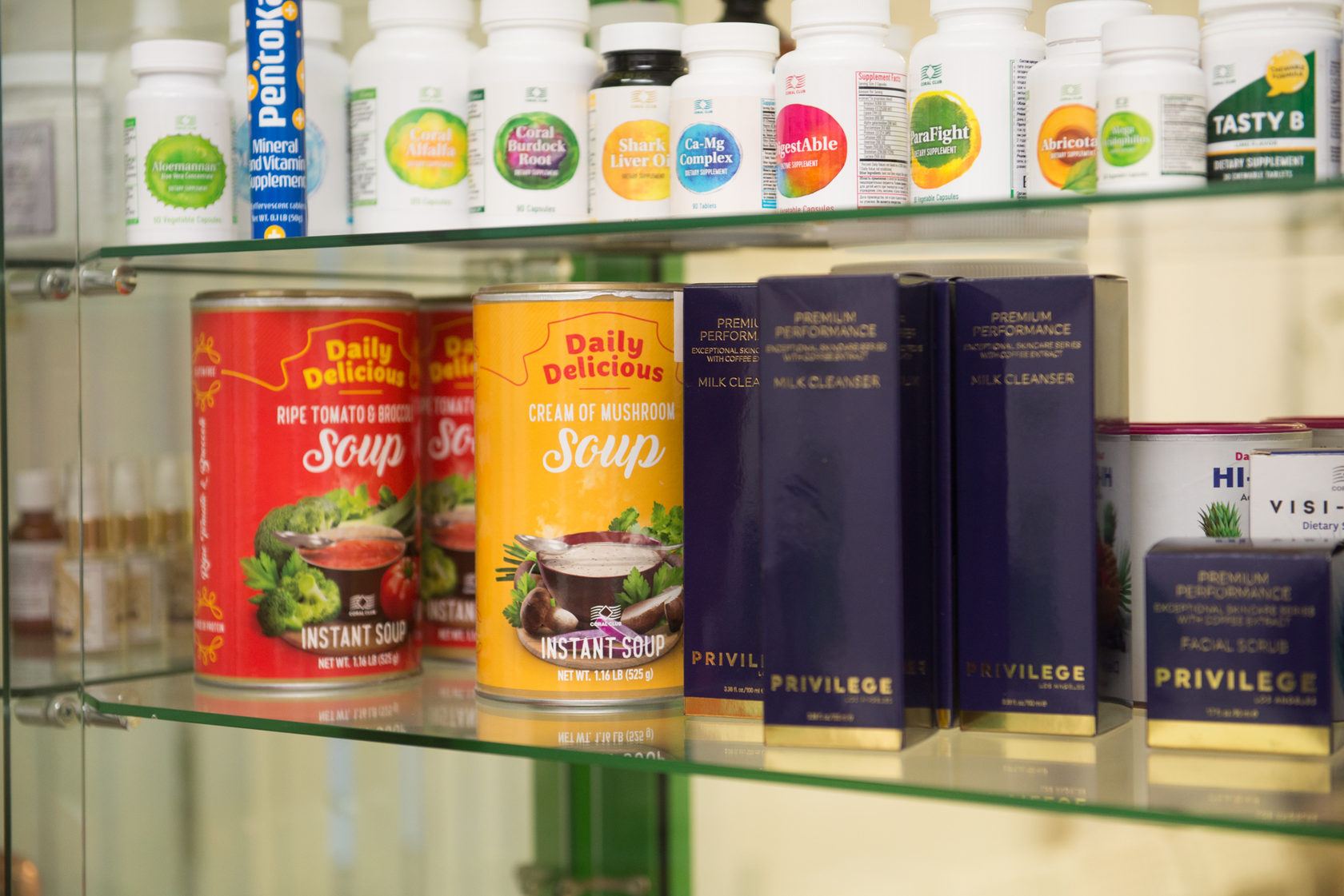 Кроме баночек с витаминами в витринах офиса —— крема для рук и ног, уходовая косметика, сухие смеси для супов или молочных коктейлей, питательные батончики.